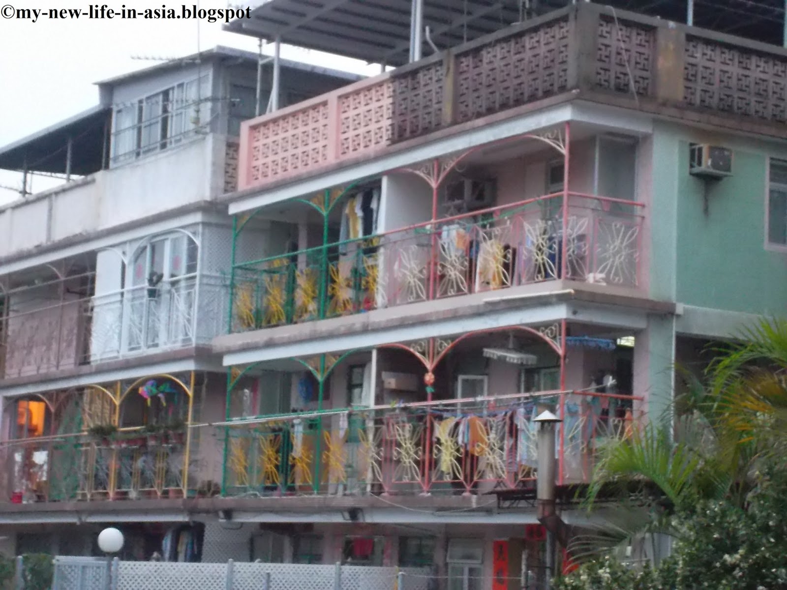 In old times houses were built of mud bricks or clay bricks, and lacked all the facilities and comforts of modern buildings. There were no paved streets, and all around there were the paddy fields where the villagers worked (ibid., p. 122). In the decades that followed Hong Kong's economic take-off (from the 1960s onward), many of those old houses were demolished, and new ones, known as "Spanish-style villas" replaced the traditional structures. They may look less interesting to tourists but are definitely more comfortable to live in (ibid., p. 110).