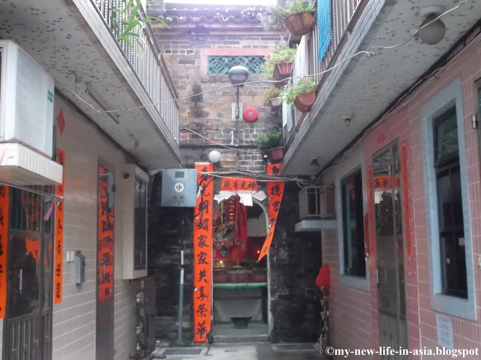 Kat Hing Wai (literally: "Walled Village of Lucky Fortune") is one of five walled villages inside the larger town of Kam Tin. It is "perfectly regular in plan, featuring a main central lane, flanked on both sides by identical rows of houses facing the same direction" (
