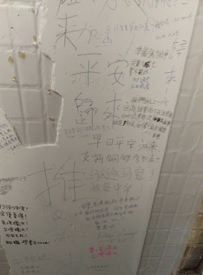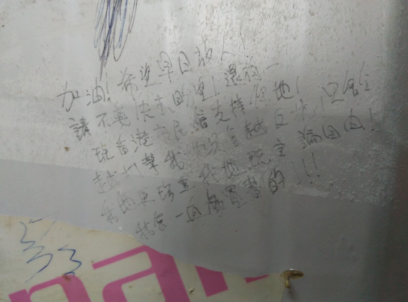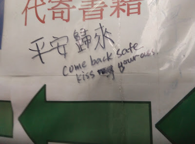 The bookstore is called "Causeway Bay Books" (銅鑼灣書店) and it's located on the second floor of a building on Lockhart Road. I and my friend went upstairs and, of course, the bookstore was closed. Next to the entrance door there were messages written on the wall by sympathetic citizens.