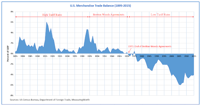 Third, when it comes to trade deficits, the chart below shows that once tariffs were lowered, the US began to incur massive trade deficits in merchandise.